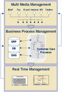 Im Modul Real Time Management werden schließlich die Echtzeitdaten gezielt aus Managementsicht ausgewertet. Kontaktgrund, Beschwerden, genutzte Kanäle, Fallzahlen, Zeiten, Kosten, Mitarbeiterauslastung sind einige der wesentlichen Stellgrößen, die sich gezielt hinsichtlich organisatorischen Ebenen und Zeiträumen auswerten lassen. Wesentlich ist, dass sich die Kundenbetreuungs-Prozesse sehr zeitnah und einfach anpassen lassen. Hiermit wird ein Business-Process-Excellence-Ansatz angestrebt, der sich durch eine hohe Agilität und Verbesserungseigenschaften vor allem auch im Hinblick auf die Qualität und Anforderungen der Kundenbetreuungs-Prozesse auszeichnet.
