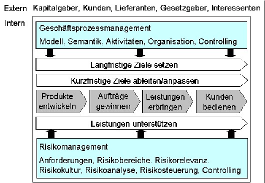 Voraussetzung für die Integration ist die gezielte Analyse der Anforderungen von externen Interessengruppen hinsichtlich Wirtschaftlichkeit, Marktbedürfnissen und gesetzlichen Rahmenbedingungen. Diese stellen die externen Grundlagen sowohl für die internen Gestaltungsanforderungen des Geschäftsprozessmanagements als auch des Risikomanagements dar. Dazu gehören z.B. ein durchgängiges Prozessmodell ausgerichtet an den strategischen Zielen sowie die Festlegung von Relevanzklassen zur systematischen Bewertung von prozessbezogenen Risiken.